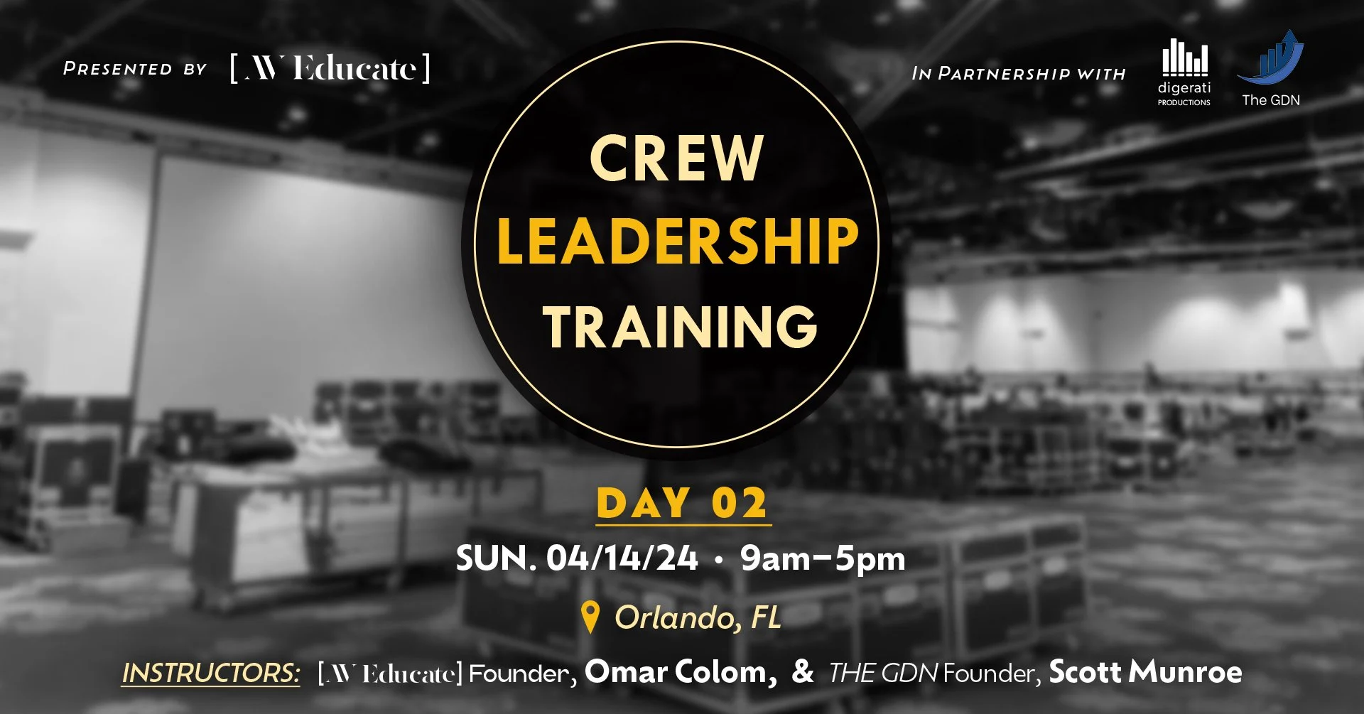 Join us for interactive discussions, drills, and simulations during our Crew Leadership Training! AV Educate's very own founder, Omar Colom, joins forces with guest instructor, Scott Munroe, of The Growth & Development Network and Digerati Productions to equip leaders with the fundamentals and practical applications of being a Crew Lead for corporate and live events!