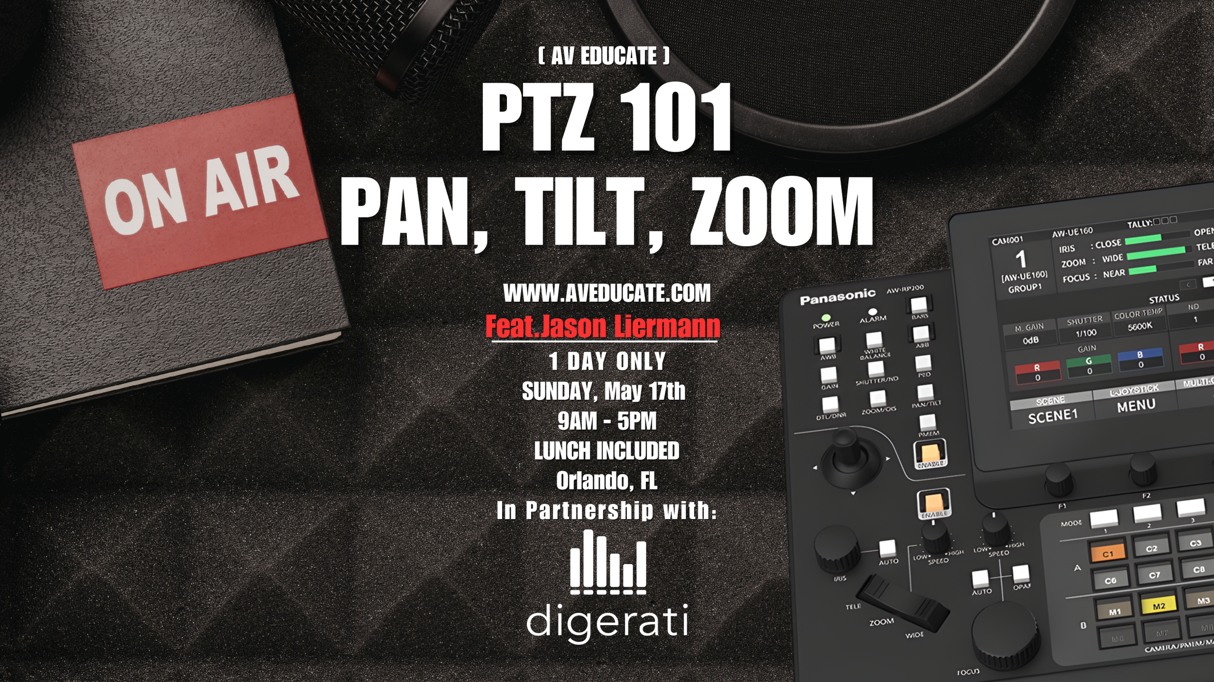 This one-day, hands-on training is built for AV professionals who want real, show-ready fundamentals in PTZ camera operation for corporate and live events. You’ll trade the tripod for a joystick and learn how to frame, move, and manage PTZ cameras with purpose—so your shots feel smooth, intentional, and consistent. AV Educate partners with Instructor Jason Liermann and Digerati Productions to EQUIP beginner-to-intermediate students with practical PTZ skills you can use immediately on gigs.